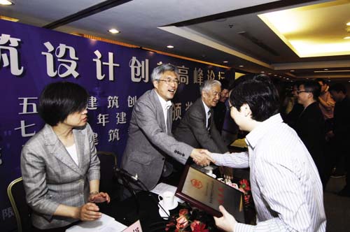 ■中國建筑學會理事長宋春華(左二)在為獲獎者頒獎